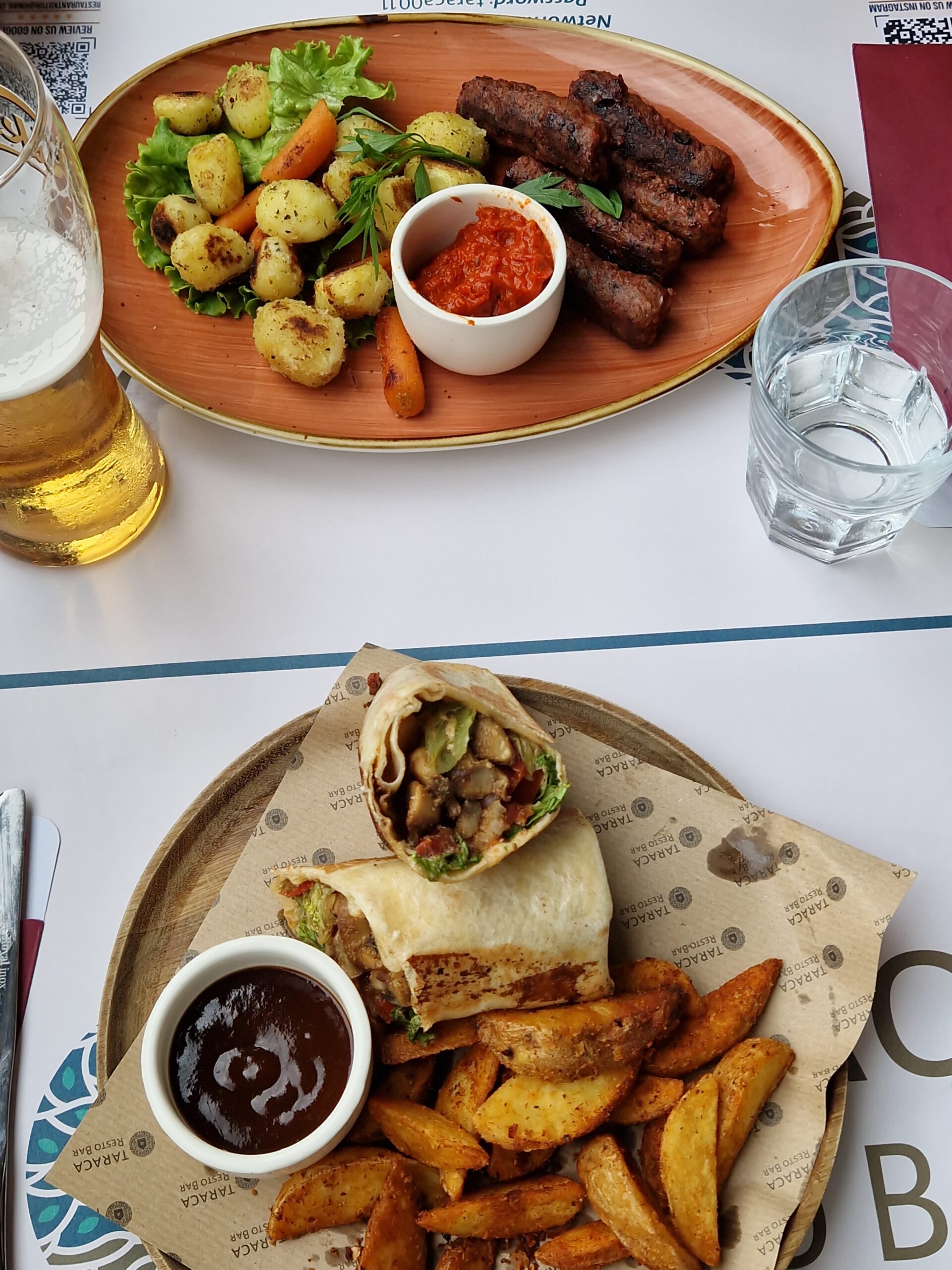 Die Küche in allen von uns bereisten Ländern ist fürchterlich fleischlastig. Und auch wenn ausnahmslos alle Länder sich selbst für ihr tolles Gemüse preisen (das man auf den lokalen Märkten auch tatsächlich kaufen kann), spiegelt sich dies leider nicht in den angebotenen Speisen in den Restaurants wieder. Andererseits muss ich positiv hervorheben, dass es praktisch überall möglich war, etwas Vegetarisches auf der Karte zu finden. Jedoch wird gegrilltes Gemüse, wenn es immer nur Zucchini, Paprika und Aubergine (ohne Gewürze) sind, halt irgendwann langweilig. Oftmals gab es noch frittierten oder gegrillten weißen Käse dazu, immerhin. In Bulgarien ist man besonders stolz auf den Schopska-Salat, den es auch in anderen Balkanländern gibt. Der Salat ist eine abgespeckte Version des griechischen Salates: Gurken und Tomaten in größeren Stückchen übereinander geschichtet, teilweise mit Paprika und Zwiebeln dazu, darüber geriebener weißer (Schafs)Käse. Gegen den Salat ist überhaupt nichts einzuwenden und dank des frischen Gemüses schmeckte er auch in der Regel lecker – aber das als Landesspezialität erscheint mir dann doch etwas unspektakulär.