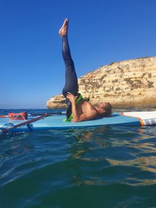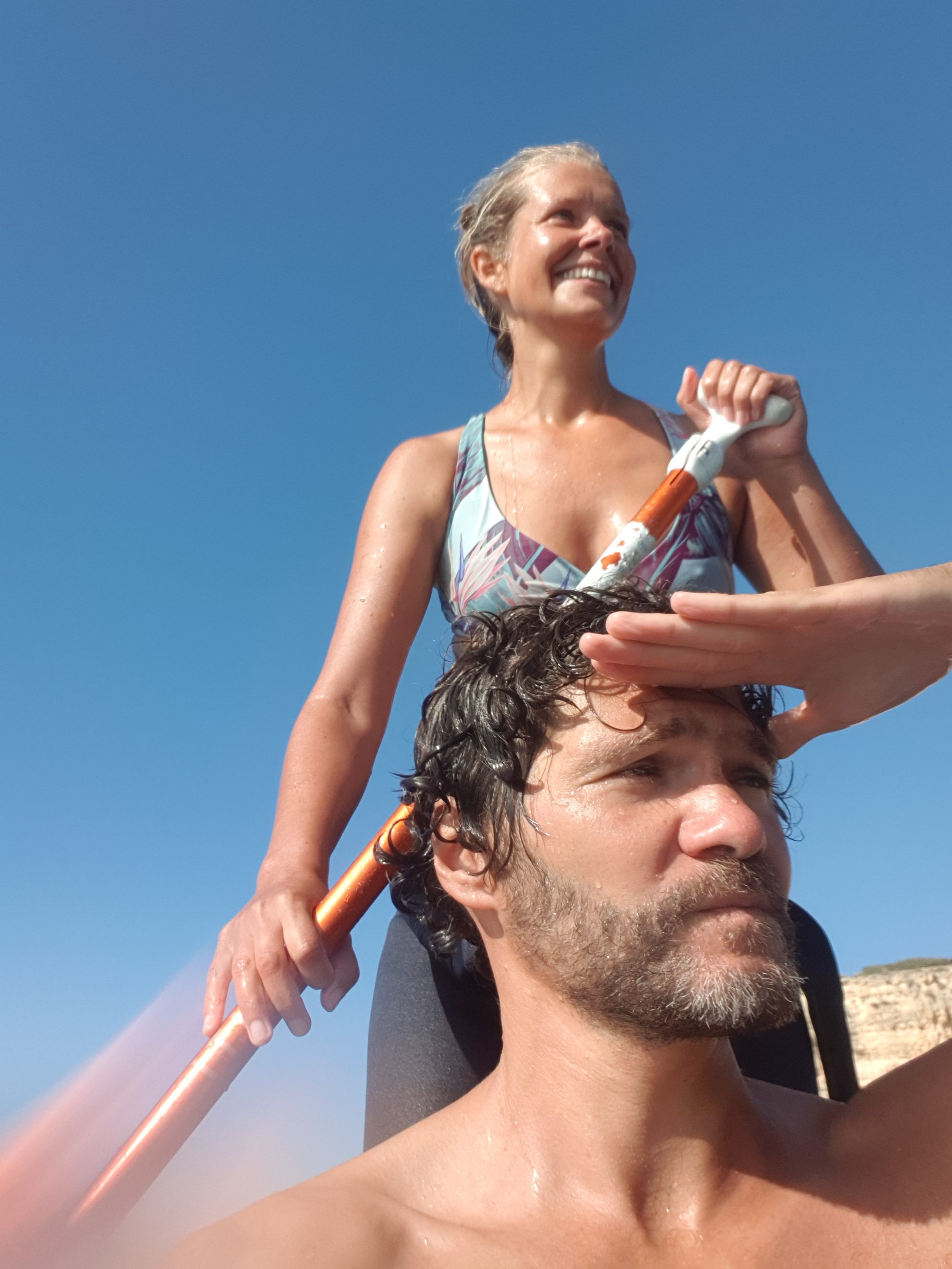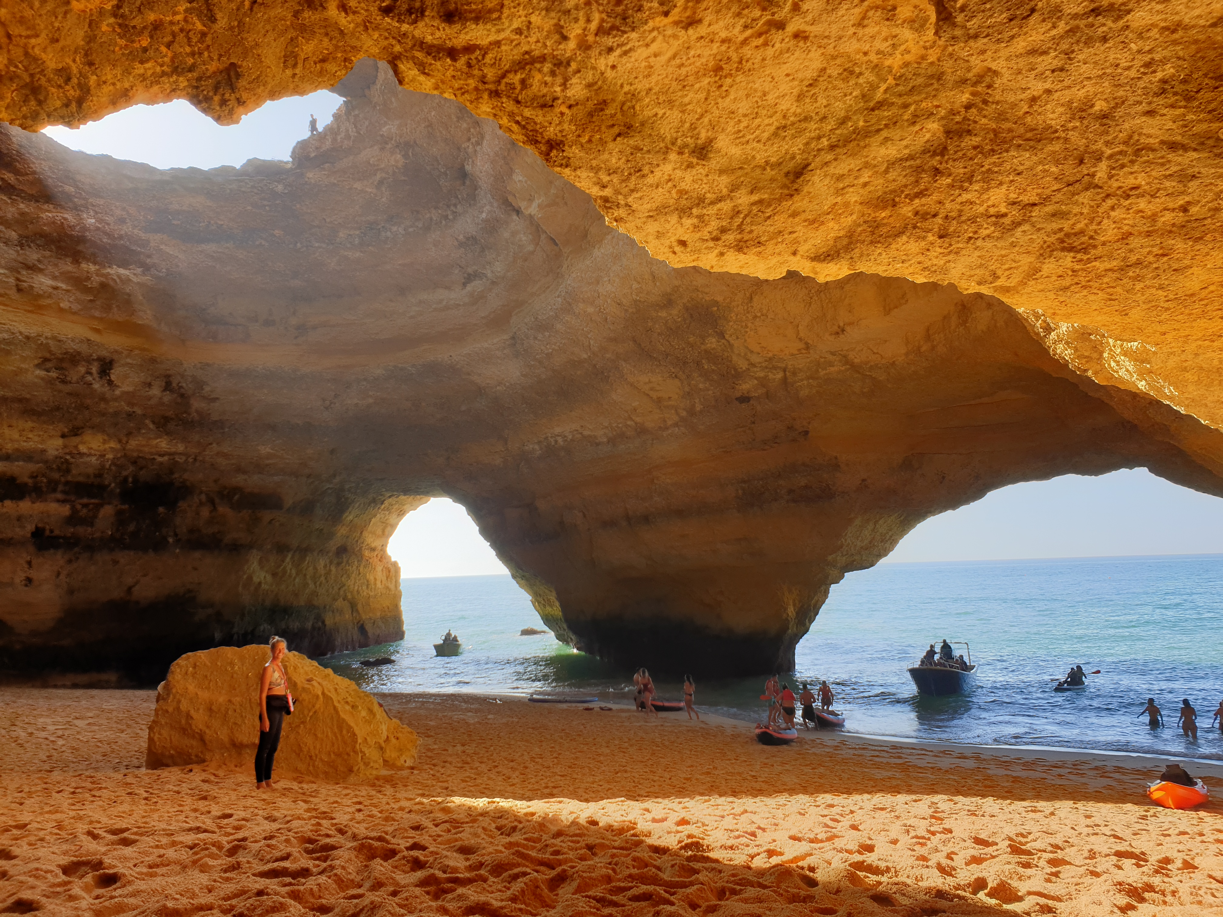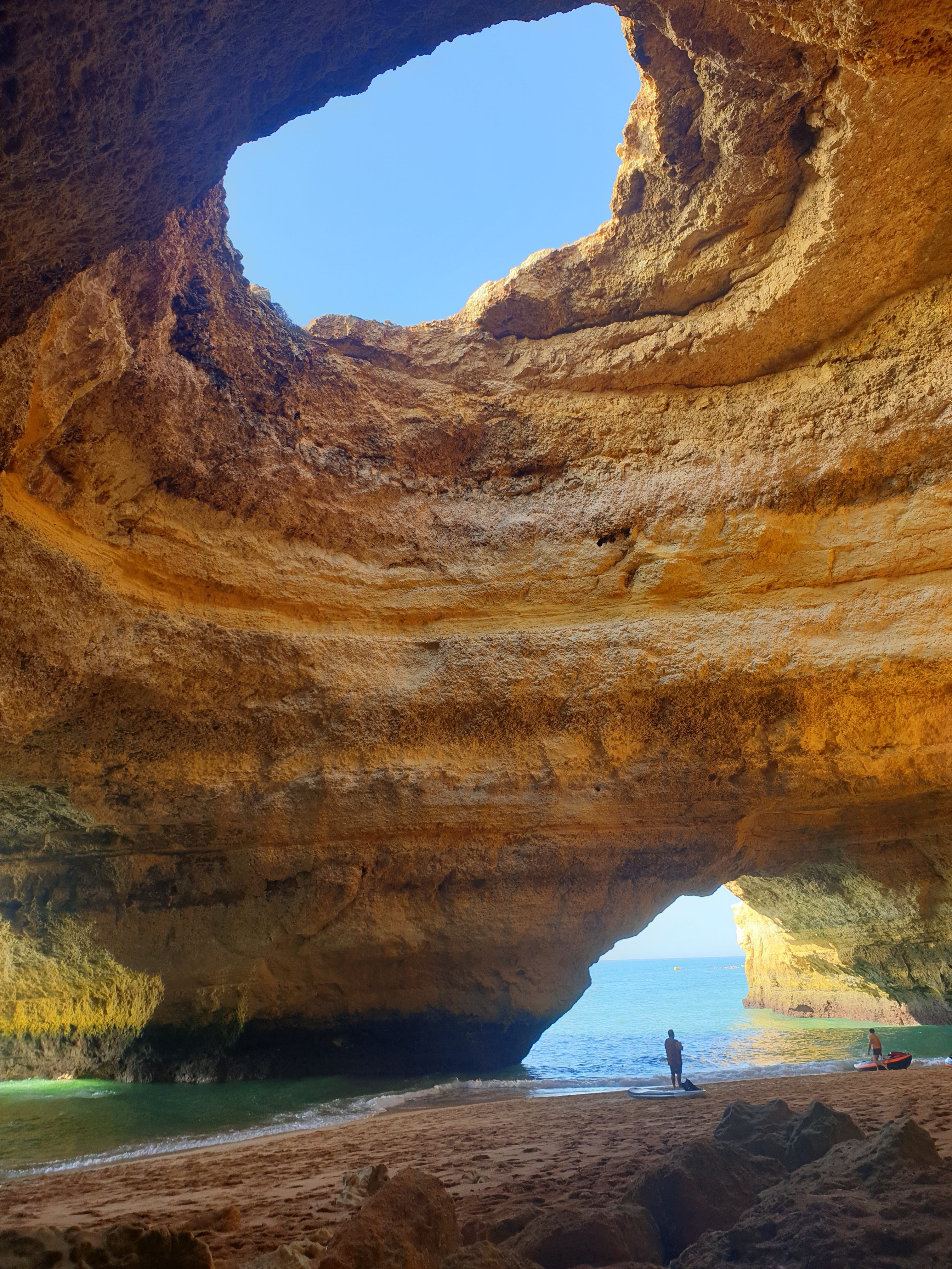Am nächsten Morgen klingelte um halb acht der Wecker. Wir schlafen schon seit einiger Zeit echt lang morgens und vor acht sind wir schon ewig nicht mehr aufgestanden. Den Tee/Kaffee gab es im Thermobecher (eine Anschaffung aus England, die wir jeden Tag nutzen) für unterwegs, denn wir wollten in die Höhle von Benagil, die nur rund um Niedrigwasser zugänglich ist. Die Höhle liegt direkt neben dem Strand, ist aber nur übers Wasser zu erreichen. Man kann eines der Touriboote nehmen, hin schwimmen oder mit dem Paddelboot oder SUP hin paddeln. Wir entschieden uns für letzteres. Ein 2er-SUP sollte es werden. Auf dem Weg zum Wasser machten wir noch Witze darüber, ob das eine weise Entscheidung war oder ob Streit vorprogrammiert wäre. Letztendlich hatten wir einfach nur super viel Spaß mit dem SUP auf und im Wasser. Mein neuer Neo konnte direkt zeigen, was er kann. Wobei das Wasser tatsächlich gar nicht so kalt war, wie erwartet. Die Höhle ist wirklich der Hammer und super beeindruckend. So haben sich die unverschämten 30 Euro für eine Stunde mit dem SUP auf jeden Fall gelohnt. Und wir überlegen schon, wie wir noch ein aufblasbares SUP in Moby Dick unterbringen können (das kann man doch bestimmt in Italien auch noch gut gebrauchen..).