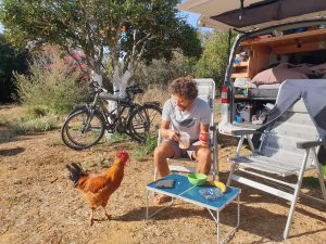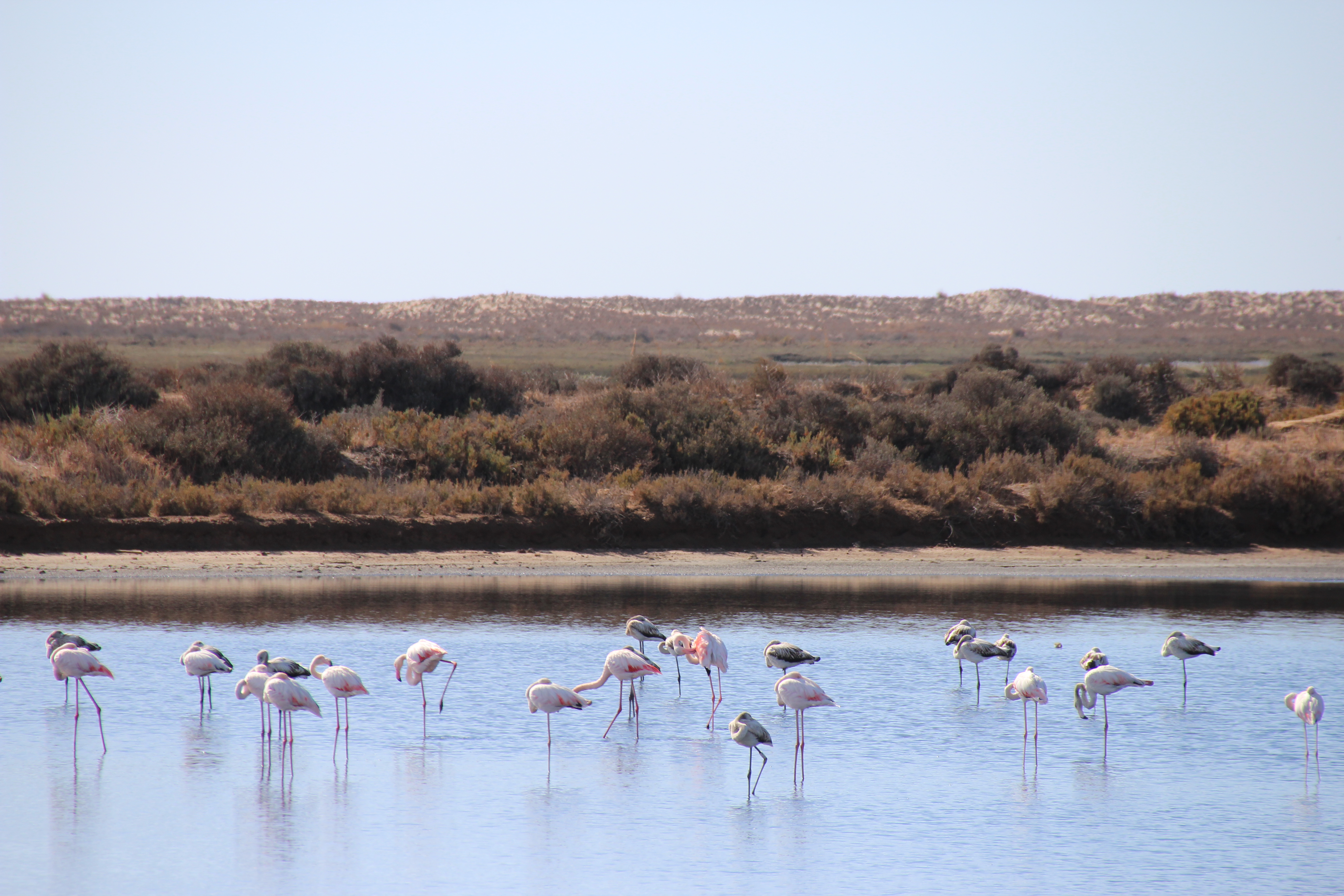 Nun stehen wir erneut auf einem hippiesken Stellplatz. Ein paar französische Althippies bewirtschaften hier in einer Kooperative ein Stückchen Land und lassen auf ihrem Hof Camper übernachten. Es gibt Komposttoiletten und einen frechen Hahn. Da mich eine Erkältung erwisch hat, machte Christian einen Radausflug in die Ria Formosa alleine (ein paar Flamingos waren auch da) und ich genoss die Ruhe auf dem Hof.