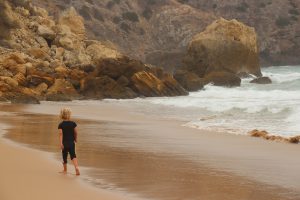 Der Strand von Marinha soll nicht umsonst einer der schönsten Portugals sein. Woher die Information stammte, man bräuchte zwei Stunden für die Strecke, wissen wir beide nicht mehr. Letztendlich waren wir nach weniger als einer am Ende des Weges angekommen. Ich brauchte eine Weile, um mich von der Enttäuschung zu erholen. Ich wäre wirklich gerne länger gewandert. Heute sollte es aber wohl nicht sein. Wir spazierten zurück und legten uns noch für ein Stündchen an den Strand – auch nicht schlecht! Abends steuerten wir einen Stellplatz im Hinterland, in Richtung des Bergörtchens Monchique an. Hier war alles sehr ordentlich und stand in ziemlichem Kontrast zu unseren zwei vorherigen Übernachtungsplätzen. Wehmütig dachte ich wieder an das Fort zurück, neben dem die Hildesheimer erneut ihr Lager aufgeschlagen hatten. Letztendlich war es aber doch ganz gemütlich und wir genossen den Komfort des Platzes und einen lauen Abend mit Blick auf die (noch aus dem letzten Jahr ziemlich verkohlten) Berge und einen beeindruckenden Vollmond.