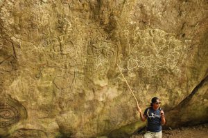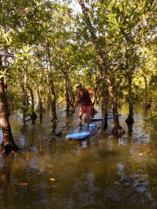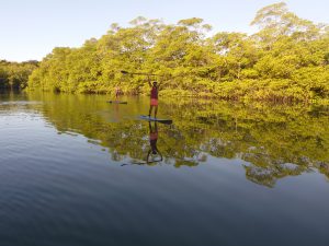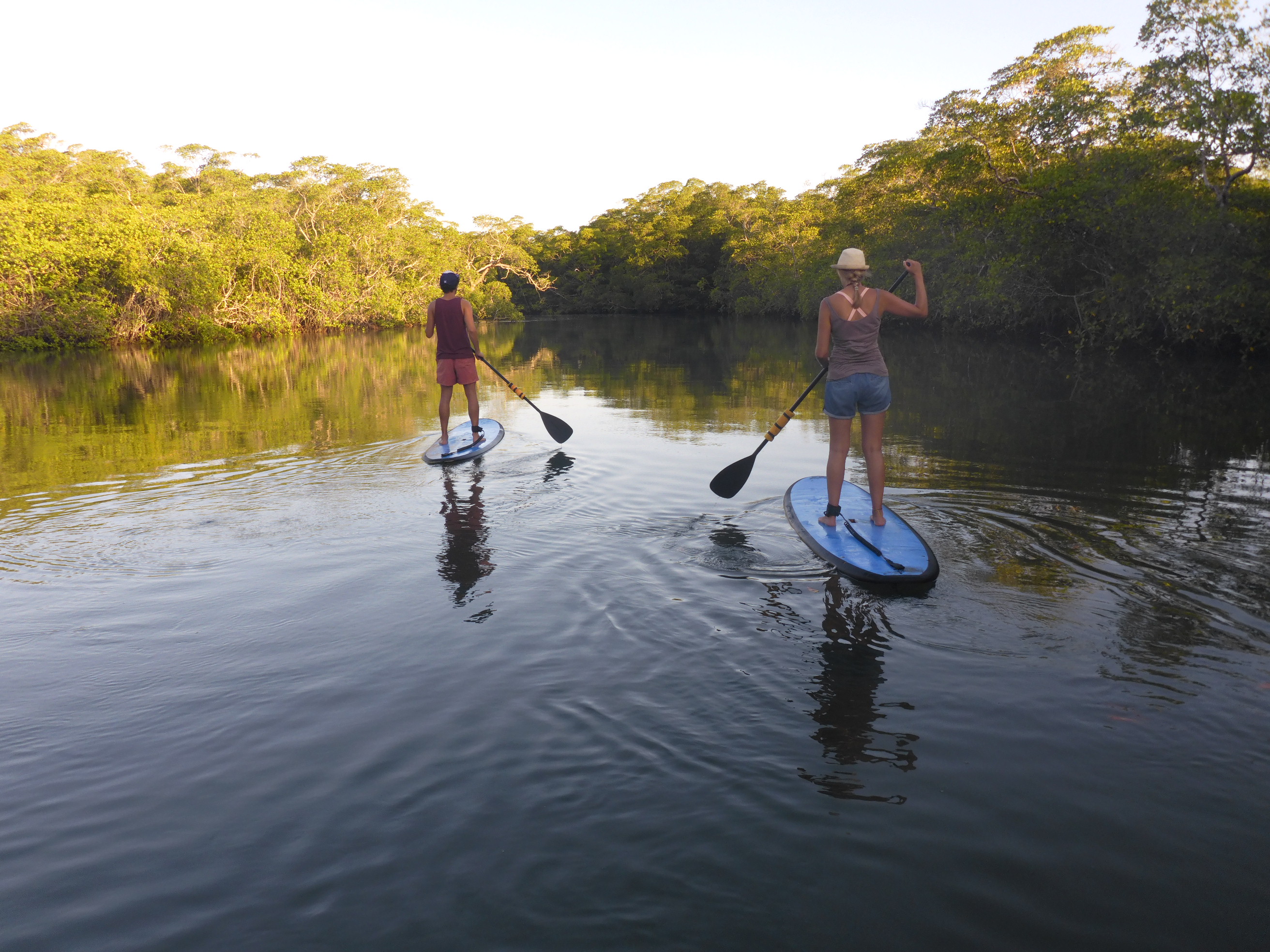 Ein wunderbares Erlebnis war auch unsere Stand-up-paddeling-Tour durch einen Mangrovenwald. Noch während der Morgendämmerung um 6:00 Uhr wurden wir von unserem Guide Matt abgeholt, tatsächlich waren wir die einzigen Teilnehmer. Nach einer 45minütigen Fahrt erreichten wir das winzige Fischerdorf El Banco. Die Sonne war zwar bereits aufgegangen, aber sie stand noch tief und das Morgenlicht sorgte für eine tolle Atmosphäre. Wir paddelten vom „Hafen“ in der Flussmündung los und genossen die Stille, nur unterbrochen von den Rufen der Vögel um uns herum. Das SUP ist das perfekte Fortbewegungsmittel für eine Fahrt durch die Mangroven. Wir glitten nahezu geräuschlos mit der Flut immer tiefer in die enger werdenden Flussarme und zwischen den Mangroven hindurch. Weit und breit war außer uns dreien keine Menschenseele zu hören oder zu sehen. Unendlich friedlich. Zwar sahen wir außer einigen Meeresvögeln, Krabben und Spinnen keine Tiere, aber das machte gar nichts, der Ausflug war auch so schon beeindruckend genug. Auf dem Rückweg, für den wir die einsetzende Ebbe nutzten, machten wir einen Stopp an einem einsamen Strand. Für das perfekte Robinson-Crusoe-feeling öffnete Matt dann noch eine Kokosnuss für uns.
