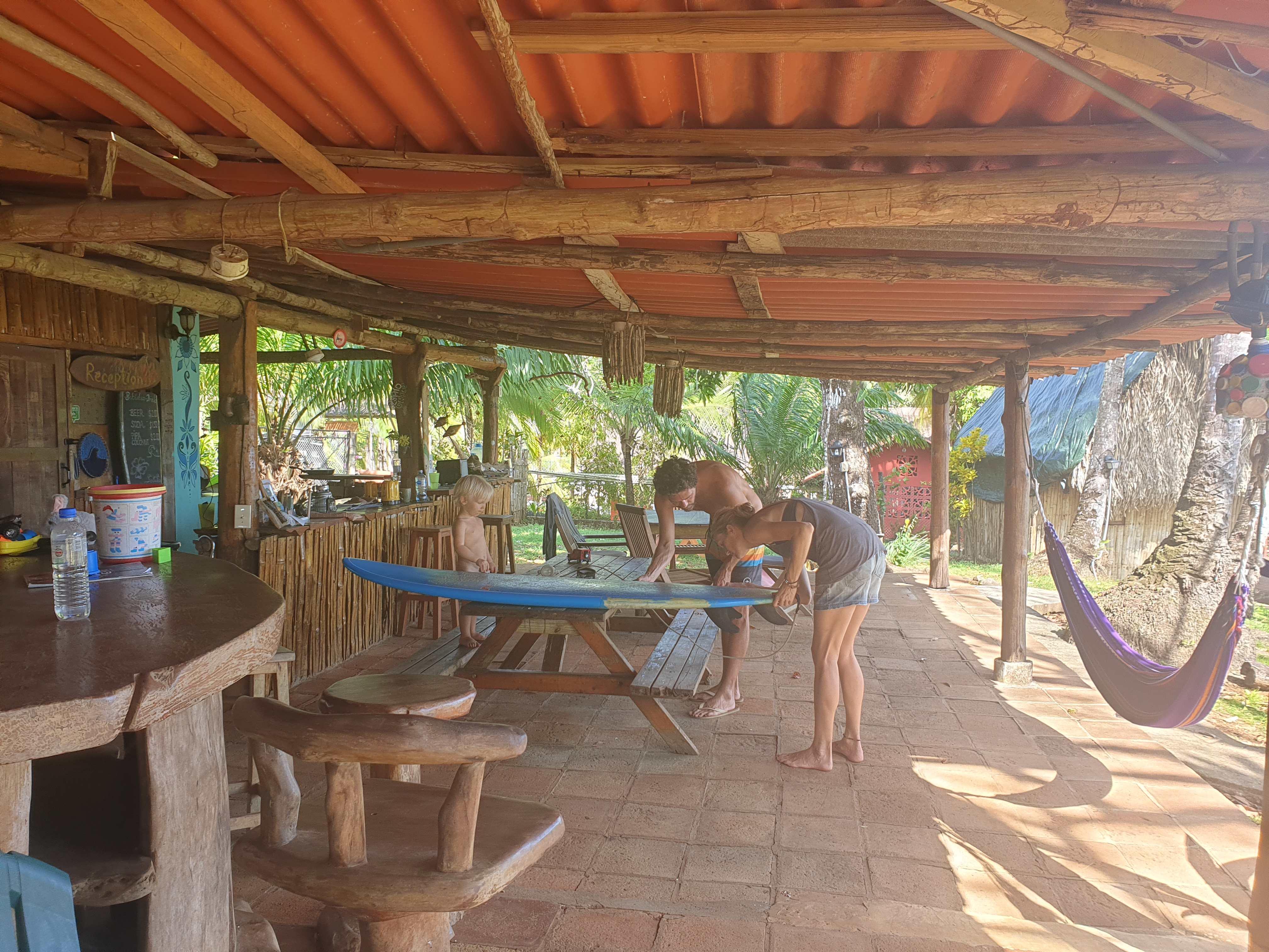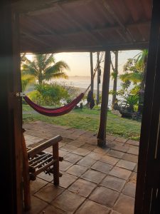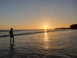 Am Freitag brachte uns Ariel morgens um 7:00 Uhr zum Bus. Mit 4 verschiedenen Bussen fuhren wir von El Valle nach Santa Catalina an die Pazifikküste. Alle Anschlüsse klappten widererwartend richtig gut uns so kamen wir bereits um 13:30 Uhr in Santa Catalina an. Der Ort ist ein ehemaliges Fischerdorf, das vor Jahren von einigen Surfern entdeckt wurde und mittlerweile bei Touristen beliebt ist. Trotzdem geht es hier noch reichlich gemächlich zu – nicht mal einen Geldautomaten gibt es. Wir wohnten im „Rancho Estero“, das die deutsche Elli und ihr baskischer Mann managen. Sie wohnen mit ihrem knapp 2jährigen Sohn Julen selbst auf dem Gelände und waren super nett. 4 Bambus- und 2 Holzhütten bieten einen schönen Blick aufs Meer und den Strand und einige Hängematten laden zum Abhängen ein. Schnell war uns klar – hier bleiben wir eine Weile. Aus geplanten 4 Tagen wurde dann eine ganze Woche. Wir verbrachten unsere Tage mit lesen, baden, aufs Meer gucken und Christian auch mit surfen. Abends bekochten wir uns in der Outdoorküche oder wir gingen mit unseren Mitgästen Manuel und Patrizia aus Madrid essen. Nachts blickten wir in den traumhaften Sternenhimmel und warteten auf Sternschnuppen.