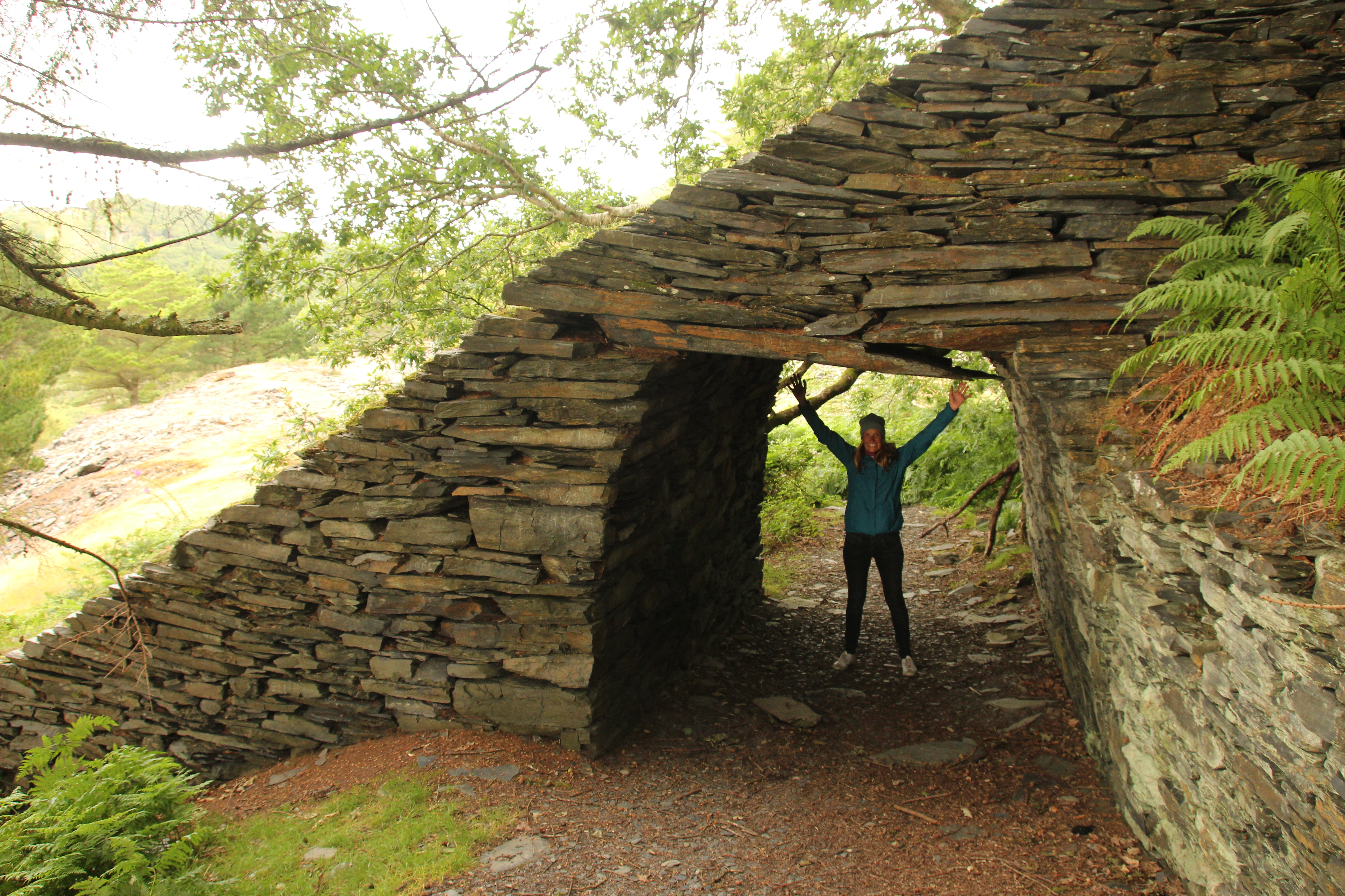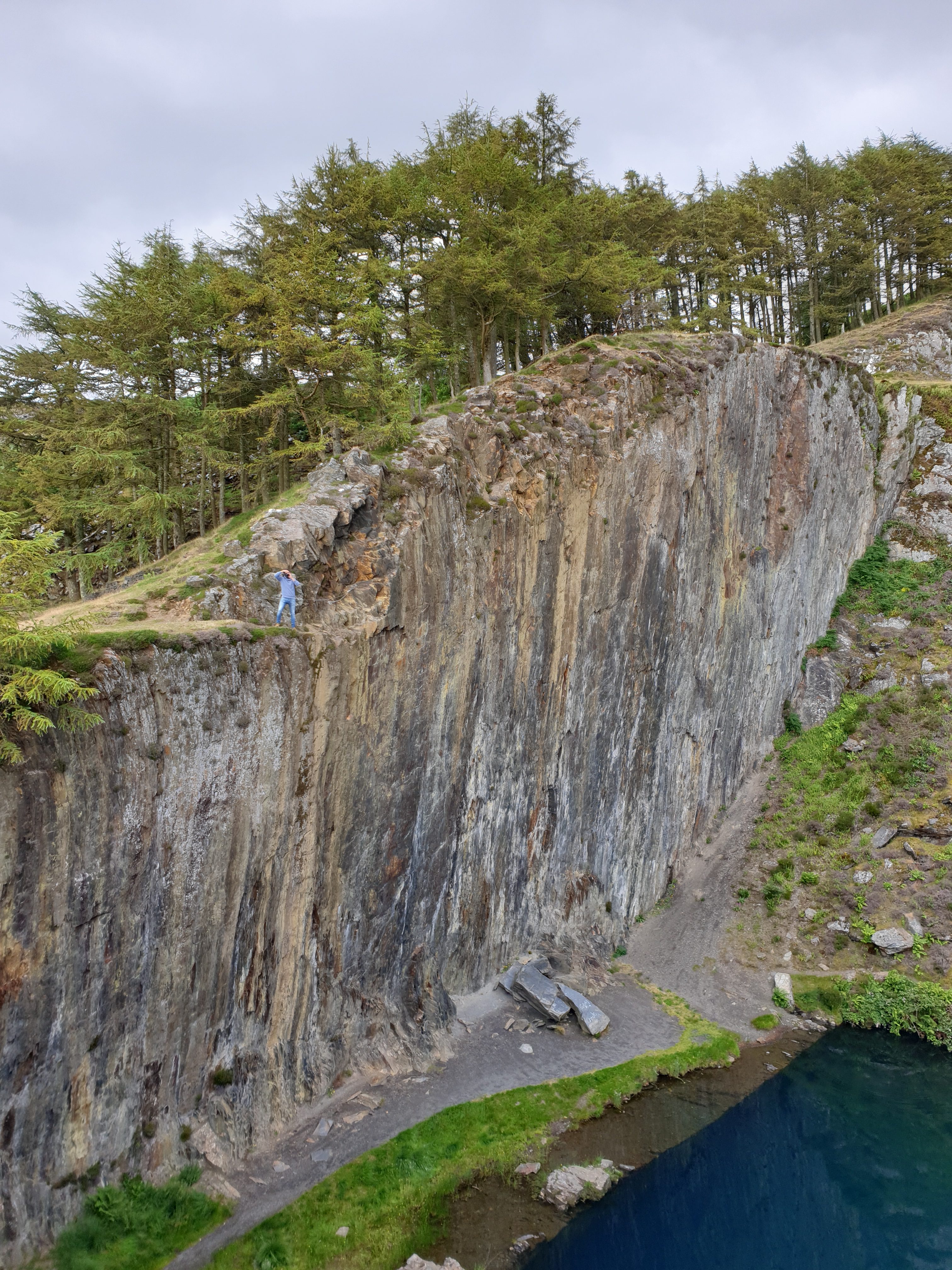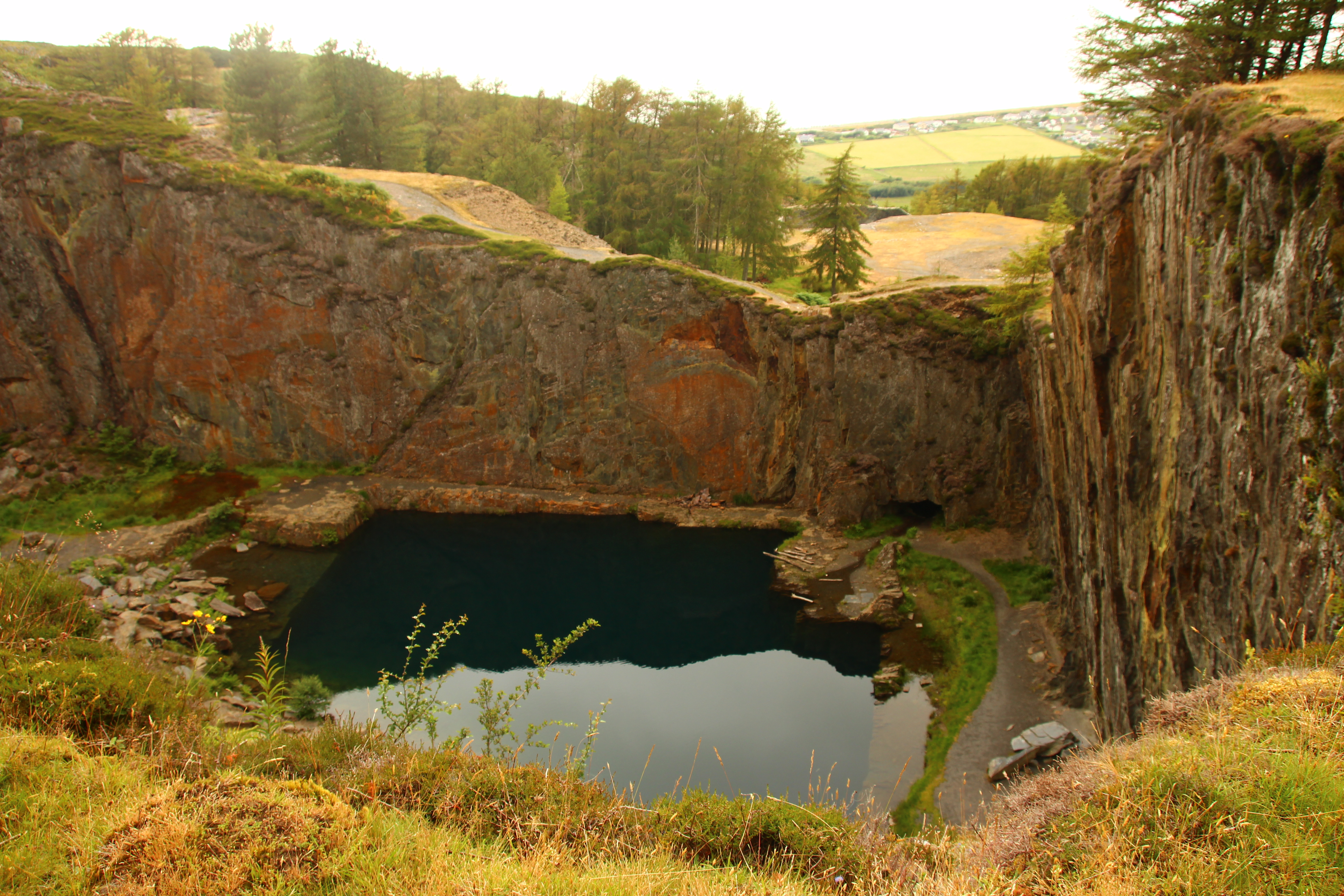 Der letzte Punkt auf der Ausflugstour war der blaue See, ein künstlicher, fast rechteckiger Pool, der durch den Schieferabbau entstanden ist. Wir arbeiteten uns den Hang hoch durch Schiefergeröllfelder und genossen dann den herrlichen Blick in das tiefblaue Wasser des Sees. Der Zugang durch einen alten Eisenbahntunnel ist leider seit diesem Jahr zugeschüttet, so dass wir nicht ins Wasser hüpfen konnten 🙁 .