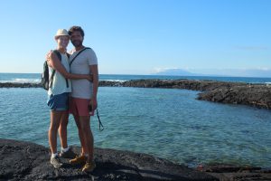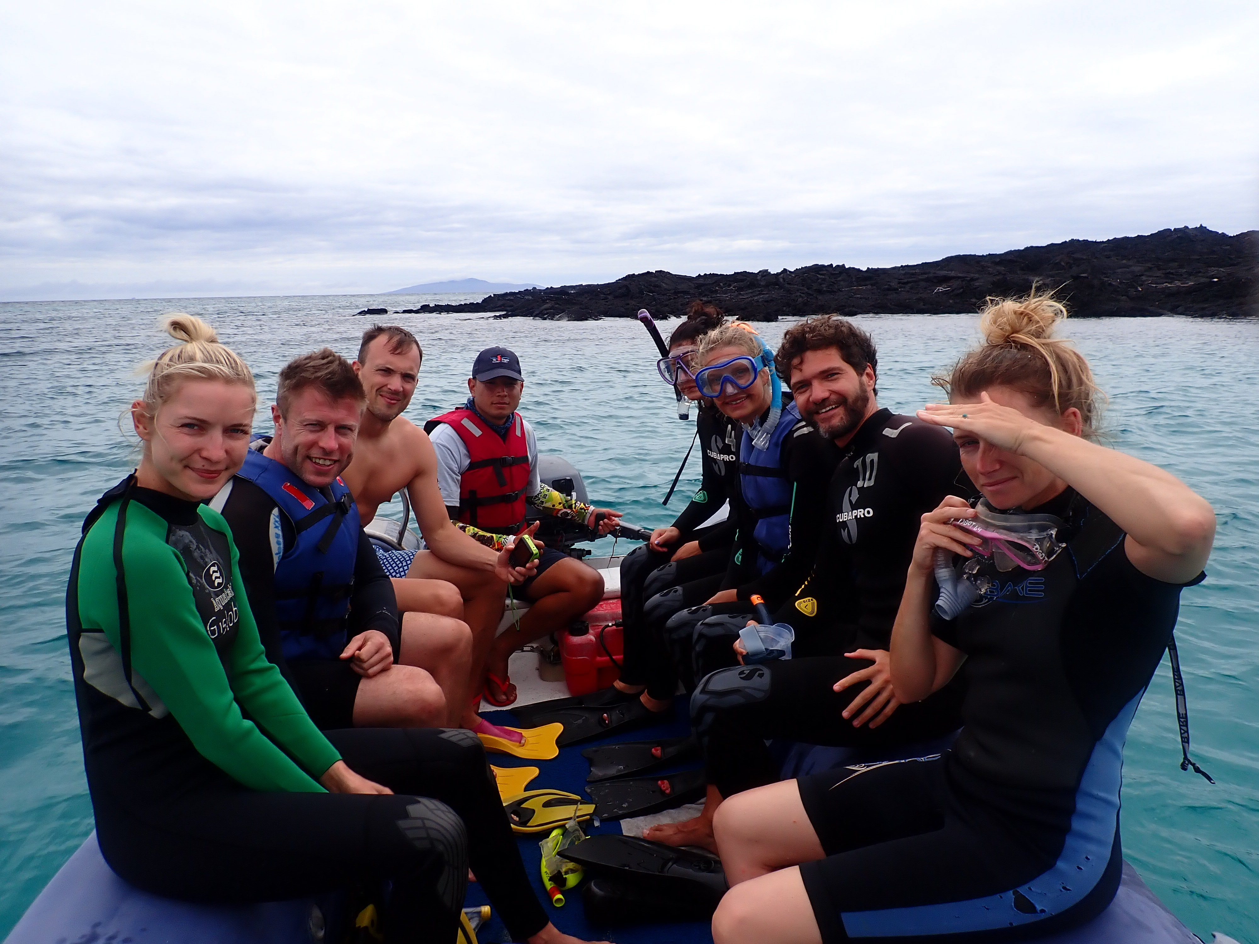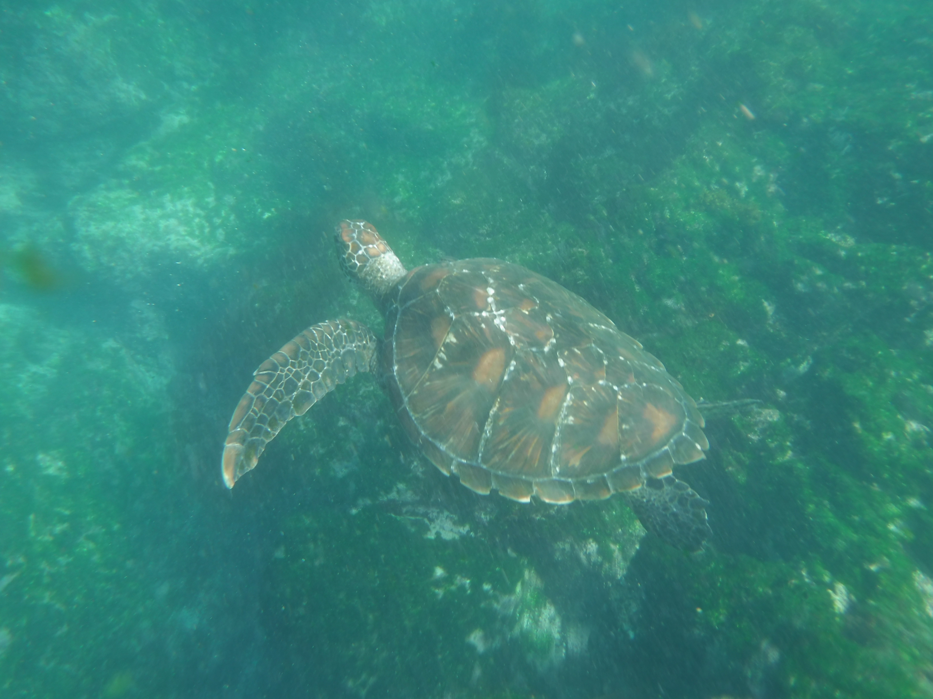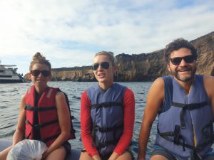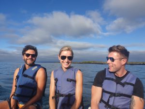Beim anschließenden Schnorchelausflug in derselben Bucht, konnten wir uns die Schildkröten von Nahem angucken. Unglaublich, wie viele von ihnen dort herum schwammen. Roberto tauchte immer wieder tief ins Meer hinunter, um besondere Fische für uns aufzuspüren und uns auf Dinge aufmerksam zu machen. Es gab auf jeden Fall einiges zu sehen. Besonders gefallen haben uns die farbenfrohen King Angelfische. Der Pinguin tauchte irgendwann unter uns hindurch, verschwand dann aber leider. Auch Doktorfische, Thunfischschulen und jede Menge bunte Seesterne gab es zu sehen. Besonders cool war der Moment, als plötzlich, im wahrsten Sinne des Wortes „out of the blue“ ein Seelöwe aus der Tiefe auftauchte und zwischen uns hindurch schwamm. Überglücklich kamen wir zurück aufs Boot, wo ein köstliches Mittagessen auf uns wartete.