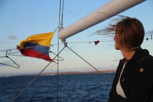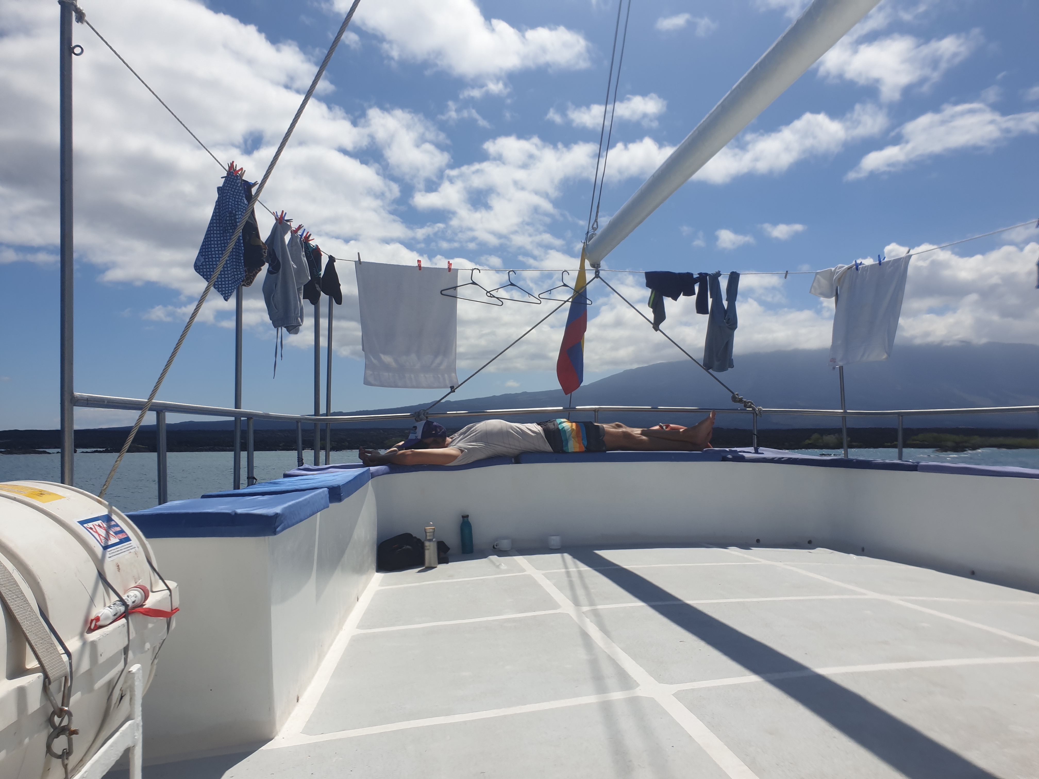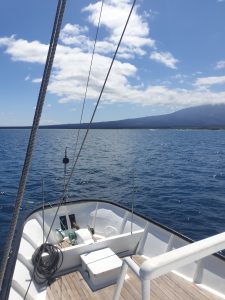 Zurück auf „unserem“ Schiff, der Golondrina, gab es auch schon direkt das Abendessen und anschließend bekamen wir eine richtige Einführung in das, was uns auf unserer 5-tägigen (im Grunde sind es 3 Tage plus An- und Abreisetag) Kreuzfahrt durch das Galapagosarchipel erwarten würde. Inzwischen hatte unser Boot begonnen los zu „segeln“. Anfangs machte mir das Geschaukel ganz schön zu schaffen. Aber draußen auf dem Sonnendeck lässt es sich immer gut aushalten.