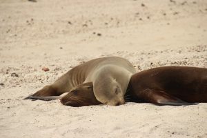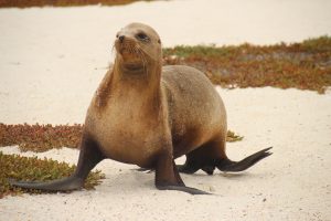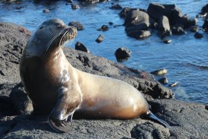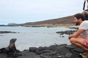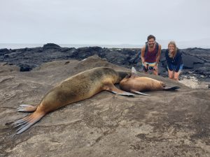 Los ging es am Freitag mit dem Shuttle vom Hotel in Quito zum Flughafen. Unser Flug hatte dann direkt eine Stunde Verspätung. Ansonsten verlief der Flug mit Zwischenlandung in Guayaquil recht ereignisarm. Bis zur Landung: 3(!) Versuche benötigte unser Pilot, eh er das Flugzeug sicher auf die Erde brachte. Nach dem zweiten Durchstarten war ich (Linda) fix und fertig mit den Nerven. Ich habe bei der Landung ohnehin immer am meisten Angst, und dann sowas. Auf dem sicheren Boden angekommen, war der Schreck allerdings schnell vergessen. Unsere Reisegruppe samt Guide wartete bereits auf uns und so ging es direkt mit dem Bus zum Hafen und aufs Boot. Das Ankommen gestaltetet sich recht hektisch: Es gab eine kleine Sicherheitseinführung des Guides, dann wurden uns die Kabinen zugeteilt und 5 Minuten später gab es das erste (sehr leckere) Mittagessen und anschießend war auch schon der erste Landgang vorgesehen. Unser Guide Roberto setzte alles daran, uns ordentlich Respekt vor den Seelöwen einzuflößen. Er warnte uns eindringlich, ihnen nicht zu nahe zu kommen und zeigte uns Bilder einer Touristin, die ins Bein gebissen worden war.