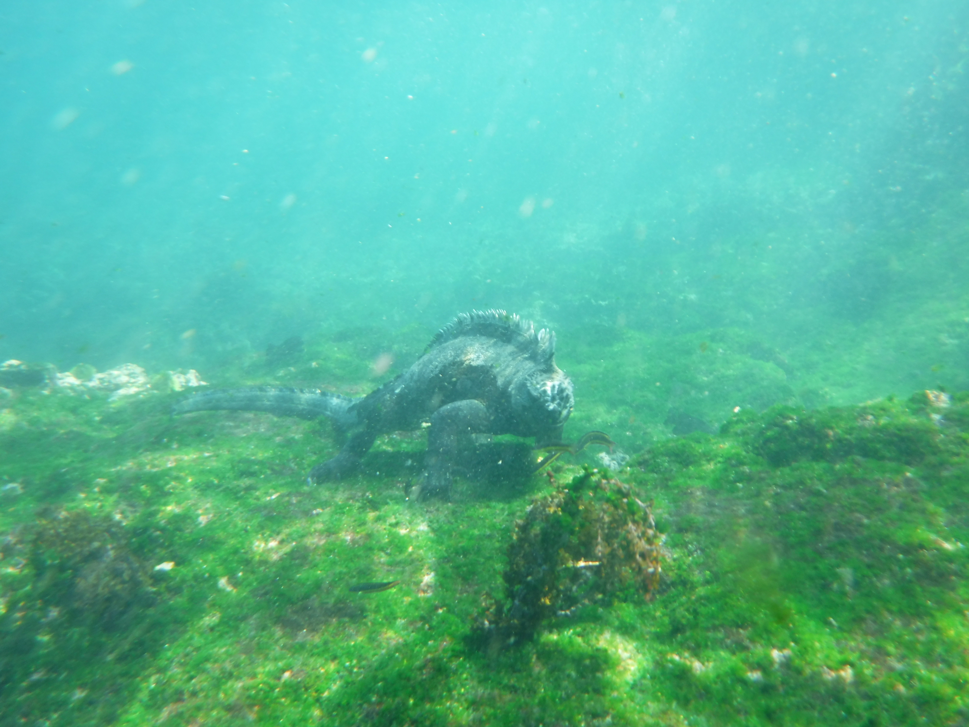 Die Mittagspause genossen wir auf dem Sonnendeck, bevor der zweite Schnorchelgang anstand. Wieder sahen wir unzählige Meeresschildkröten. Diesmal aus noch größerer Nähe – ein Traum! Die Tiere ließen sich überhaupt nicht von uns stören und man musste fast schon aufpassen, nicht mit ihnen zu kollidieren. Auch die urzeitlichen Meeresleguane schwammen teilweise um uns herum. Dazu wieder viele verschieden Fische, deren Namen wir nicht kennen.