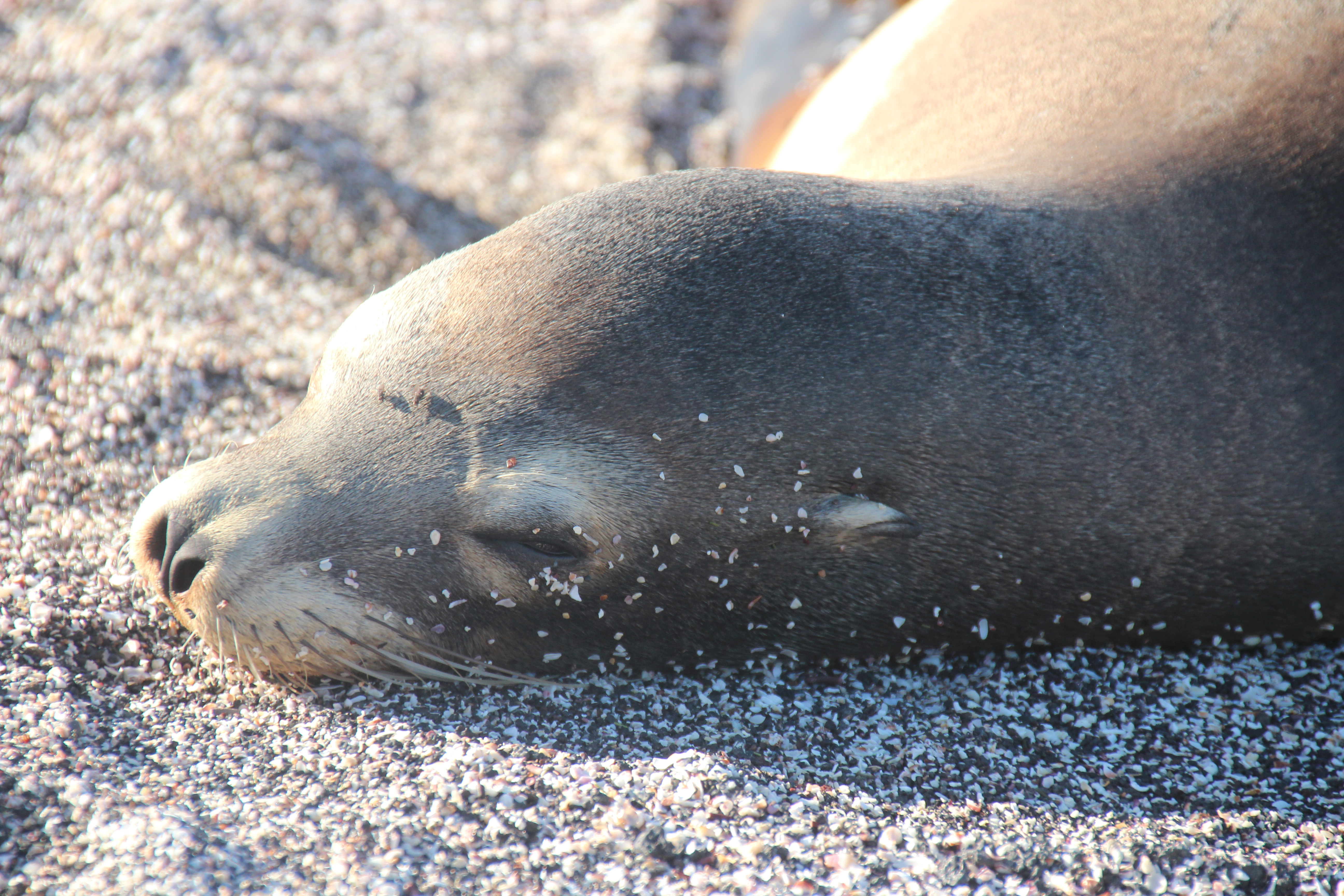 Dort wimmelte es nur so von Seelöwen – an Land und im Wasser. Noch etwas unter Kultur- bzw Naturschock aber überglücklich spazierten wir über die kleine Insel und achteten akribisch darauf, die 2m Sicherheitsabstand zu den Seelöwen einzuhalten. Das war gar nicht so einfach, denn sie lagen wirklich überall herum und wir stolperten geradezu über sie. Nur zwei Mitglieder unserer kleinen Gruppe trauten sich anschließend ins Wasser, um zu Schnorcheln. Wir anderen saßen am Strand und ärgerten uns etwas über unseren Guide, der uns doch leicht verschreckt hatte, mit seinen Horrorgeschichten.