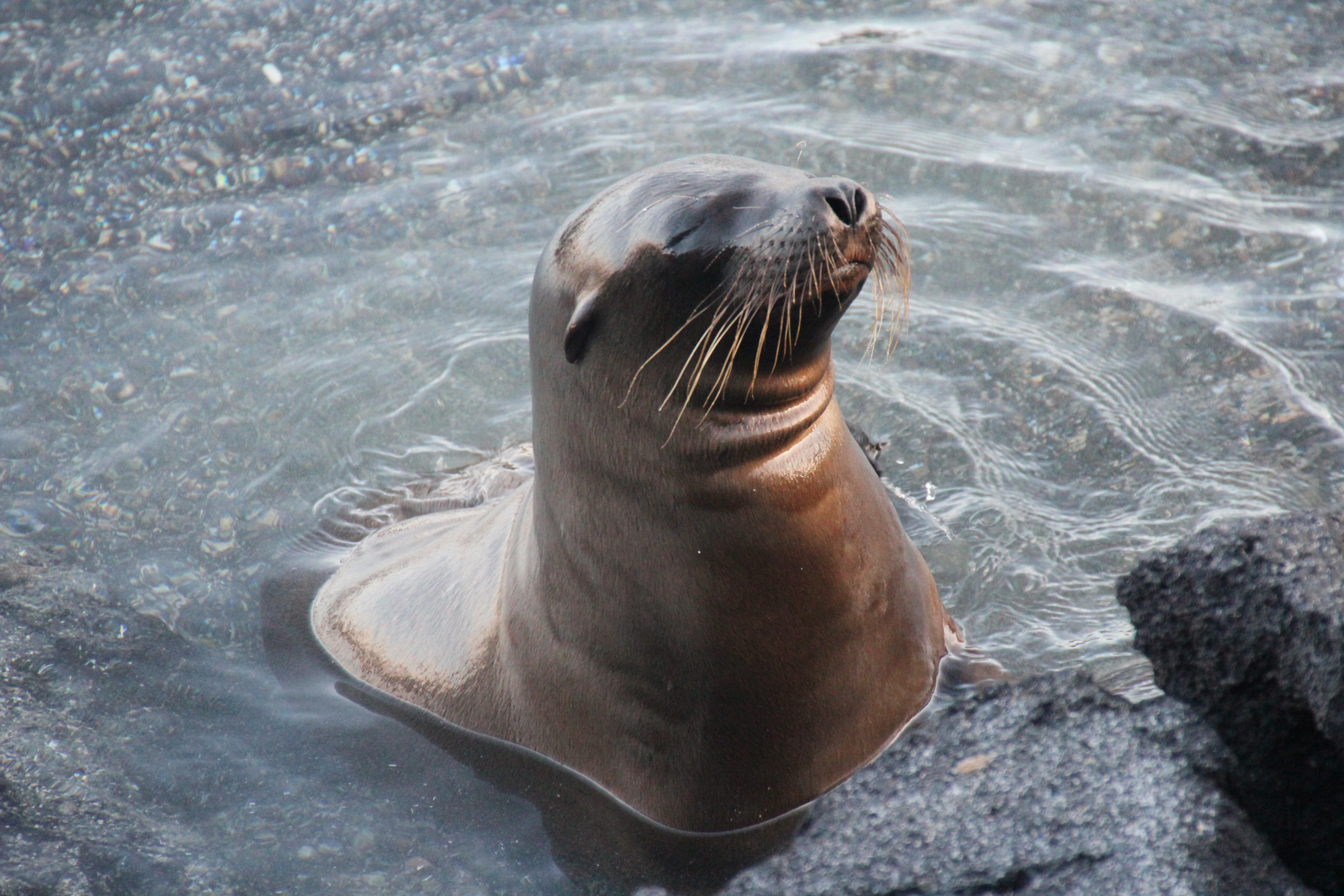 Nach einer langen Fahrt legten wir nach dem Mittag zu unserem letzten Landgang am Chinese Hat an. Jede Menge Seelöwenbabys begrüßten uns und robbten neugierig auf uns zu – sooo niedlich!