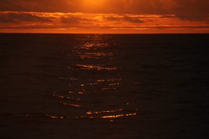 Vor dem Abendessen genossen wir vom Bug des Bootes aus einen wunderschönen Sonnenuntergang. Gegen 19:00 Uhr durften wir dem Kapitän über die Schulter schauen, während wir den Äquator überquerten.